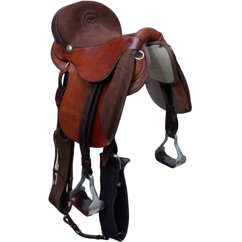 Composição:Casco com abas, borrainas frontais pra melhor apoio as pernas, ferragem metal branco anti ferrugem, cabeçada, rédea, loros, latego e c/látego, estribo e barrigueira.